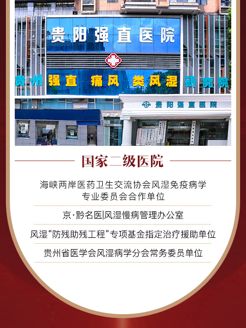 贵阳强直医院(前身:贵阳中医风湿病医院)是由卫健委审批的国家二级医院,总建筑面积5000多平方米,规划病床位200余张,下辖有贵阳痛风医院、贵阳强直风湿医院,医院是亚太痛风联盟(HGMC)贵阳分中心、中国中医药研究促进会中医药传承发展工作委员"痛风风湿疑难病会诊基地"、海峡两岸医药卫生交流协会风湿免疫病学专委会医学交流与合作单位(风湿专委会第二届委员单位)、贵州省医学会风湿病学分会常务委员单位、贵州省残疾人福利基金会"风路同行·健康贵州公益行"专项基金指定治疗援助单位、贵州红十字帮益帮医疗救助基金爱心救助定点医疗机构、贵州省肢残人协会扶残助残先进单位,也是全国第一批"免疫吸附治疗技术培训基地"、贵阳市第四人民医院(贵阳市骨科医院)骨科/创面治疗与修复专科联盟成员单位。