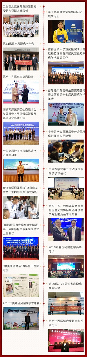 此外为充分发挥专家资源优势,贵阳强直医院与北京大学人民医院、北京积水潭医院、北京友谊医院、北京中医药大学房山医院、北京朝阳医院、卫健委直属中日友好医院等国内20余家三甲医院建立长期协作诊疗关系,定期开展"中西医结合诊疗"、"抗复发治疗"、"疑难病例"、"慢病管理"等多方位的研讨、会诊。多学科联动,共抗痛风风湿病疑难杂症。